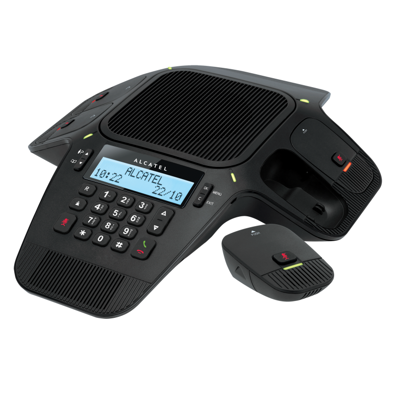 Το Alcatel Conference 1800 είναι ένα καινοτόμο και επαναστατικό σύστημα ήχου διασκέψεων που αποτελείται από τη κεντρική μονάδα και τέσσερα φορητά μικρόφωνα DECT. Ταυτόχρονα υπάρχουν και δύο σταθερά μικρόφωνα που βρίσκονται στο μπροστινό και πίσω μέρος της κεντρικής μονάδας. Τα τέσσερα φορητά μικρόφωνα DECT μεγιστοποιήσουν την κάλυψη ενός δωματίου και είναι σχεδιασμένα για να οργανώσετε μία συνέδρια με έως δεκαπέντε άτομα. Αυτό το τηλέφωνο συνδιαλέξεων έχει τη λειτουργία DNR (Δυναμική Μείωση Θορύβου) , η οποία εξαλείφει αυτόματα θορύβους και επιτρέπει σε ένα παραγωγικό και άνετο περιβάλλον εργασίας.