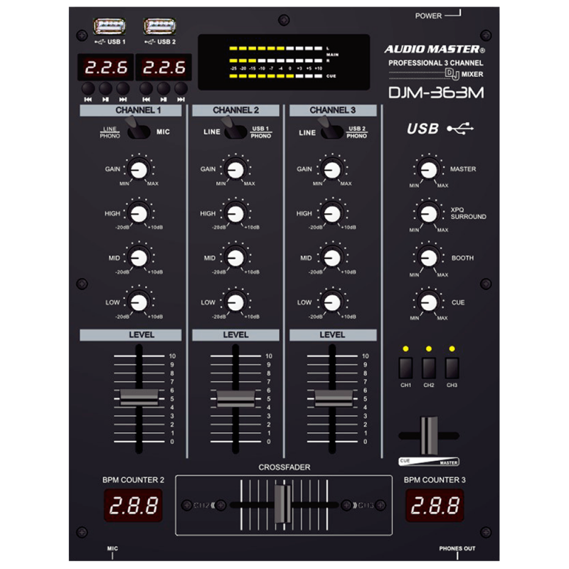 DJ μίκτης 3 καναλιών. Διαθέτει εισόδους: 3 phono,3 line,1 mic. 2 USB player με οθόνες led & Buton χειρισμού. Ρυθμιστικά Bass ,mid ,treble για κάθε κανάλι. VU meter για την έξοδο. 2 έξοδοι 5V peak to peak. Ισχυρή έξοδος ακουστικών. Εξοδο balanced (XLR), beat meter. XPQ stereo surround effect. Κατάλληλος για χρήση σε bar & club. Διαστάσεις (WxHxD) 223x115x287mm . Βάρος 2,7kg.