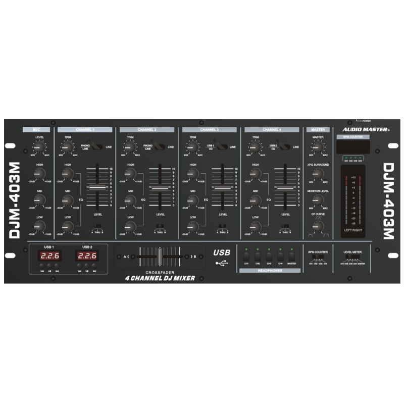 DJ μίκτης 4 καναλιών. Διαθέτει εισόδους: 2 phono,4 line,2 cd,1 mic. 2 USB player με οθόνες led & Buton χειρισμού. Ρυθμιστικά Bass ,mid ,treble για κάθε κανάλι. VU meter για την έξοδο. 1 έξοδος 5V peak to peak. Ισχυρή έξοδος ακουστικών. Εξοδο balanced (XLR), beat meter. XPQ stereo surround effect. Κατάλληλος για χρήση σε bar & club. Διαστάσεις (WxHxD) 482x115x200mm . Βάρος 3,5kg.
