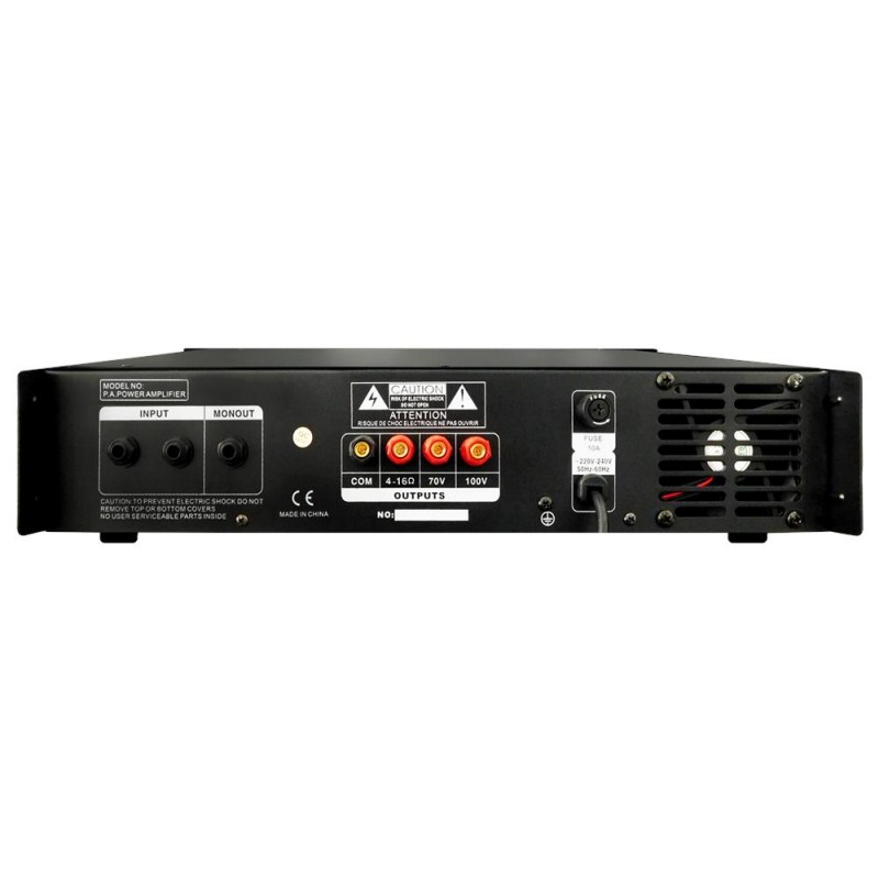 Τελικός ενισχυτής με ισχύ 250W RMS & 2 εισόδους. Επιλογή λειτουργίας 100V/70V/4-16Ω. Διαθέτει 2 εισόδους AUX & έξοδο LINE-OUT. Ευαισθησία εισόδου 1V. Ενισχυτής class AB, frequency response: 80Hz~18ΚHz. THD:<1%. Ανεμιστήρας υψηλής ταχύτητας. Protections: Short circuit, delayed on, thermal, overload, DC faults. Ο ενισχυτής διαθέτει συστημα ειδοποίησης ALARM SERVICE. Σε περίπτωση βλάβης του ενισχυτή ηχητική ειδοποίηση (buzzer) ενημερώνει ότι ο ενισχυτής δεν έχει έξοδο. Διαστάσεις (HxWxD) 88x482x400mm . Βάρος 11.50kg.