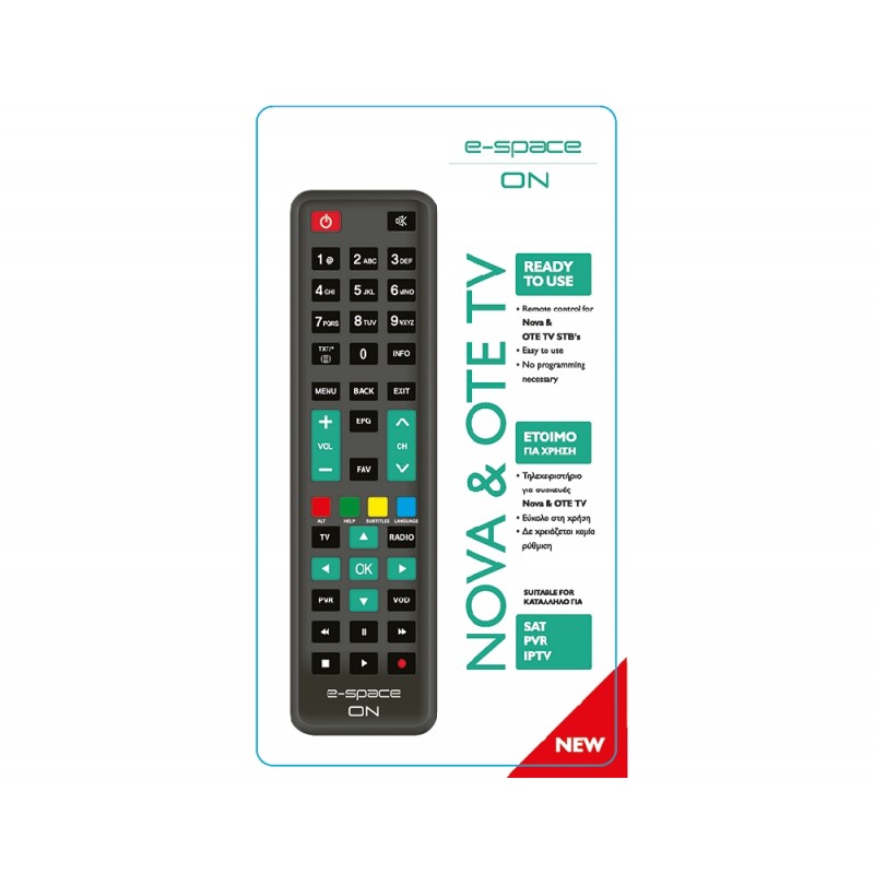 Το E-SPACE ΟΝ είναι έτοιμο και προγραμματισμένο τηλεχειριστήριο άμεσης αντικατάστασης για συσκευές Nova & OTE TV.