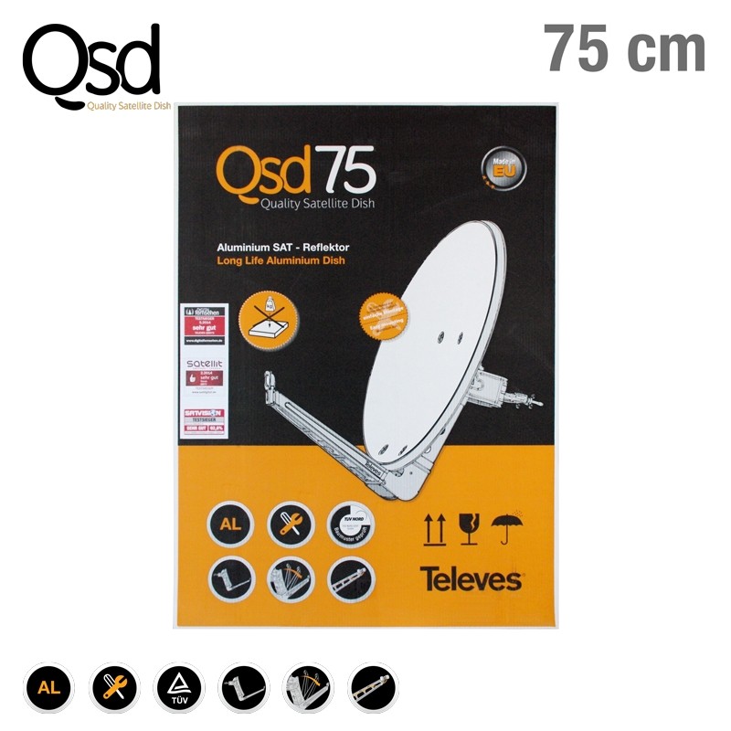Δορυφορική Κεραία Televes 7902 QSD 75cm Aluminum Πορτοκαλί. Επιφάνεια κατόπτρου απο κράμα αλουμινίου με ειδική επεξεργασία θερμής επικάλυψης ψευδαργύρου και ηλεκτροστατική βαφή πούδρας για μέγιστη αντιδιαβρωτική προστασία και αντοχή σε ιδιαίτερα αντίξοες καιρικές συνθήκες. Διαθέτει προεγκατεστημένο, αναδιπλούμενο βραχίονα LNB βαρέως τύπου με εσωτερική όδευση καλωδίου και χυτή μεταλλική στήριξη LNB απο κράμα Zamak. Διαθέτει ανοξείδωτες βίδες και συσκευασία ενός [1] τεμαχίου. TUV εγκεκριμένο.