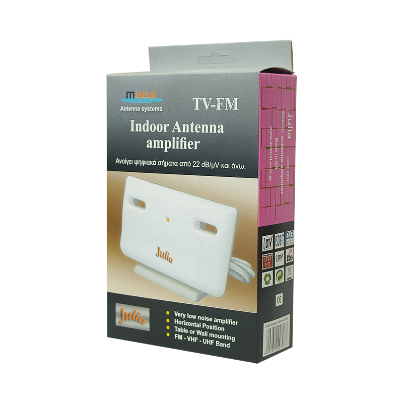MISTRAL JULIA Κεραία εσωτερικού χώρου, με ενσωματωμένο ενισχυτή 22dB. Ελληνικής παραγωγής , με πολύ καλά χαρακτηριστικά και υψηλή απόδοση. Με προσεγμένη αισθητική και μικρό μέγεθος. Λειτουργεί με σύνδεση στο δίκτυο 220VAC ή με DC 12-24v για ευελιξία χρήσης.
