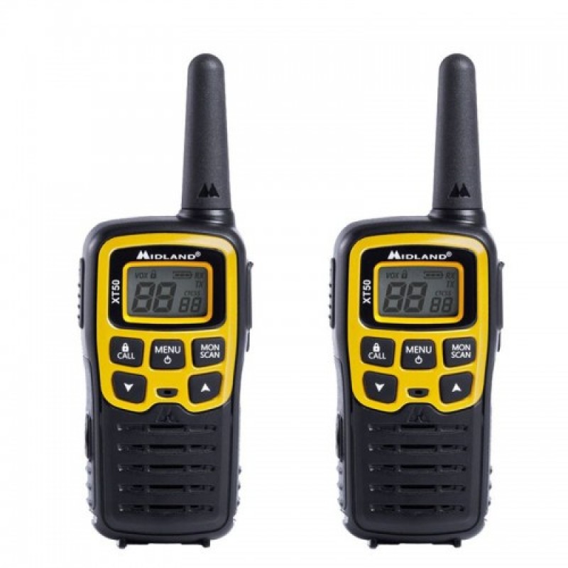 Τα νέα Midland XT50 διαθέτουν 24 διαφορετικά κανάλια επικοινωνίας (PMR446), μέγιστης εμβέλειας 8km (σε ανοιχτό χώρο - εξαρτάται από τη μορφολογία του εδάφους), για να επικοινωνείτε ανέξοδα όπου και αν βρίσκεστε. Διαθέτουν λειτουργία VOX με 3 επίπεδα ευαισθησίας για εκπομπή χωρίς το πάτημα κουμπιού.. Tο μικρό τους μέγεθος & βάρος (μόλις 93gr χωρίς μπαταρίες), τα καθιστούν κατάλληλα για εύκολη μεταφορά.