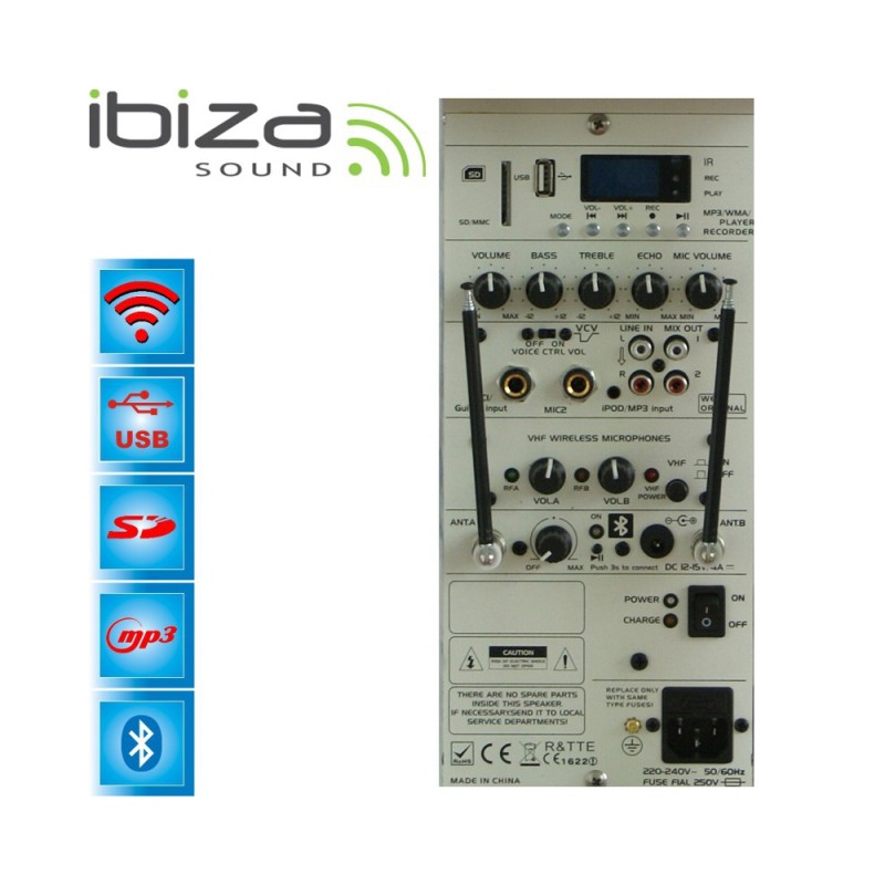 Εκτός από την εξαιρετική ποιότητα ήχου αυτής της κατηγορίας προϊόντων, αυτό το φορητό σύστημα προσφέρει σημαντικά χαρακτηριστικά όπως μια ενσωματωμένη επαναφορτιζόμενη μπαταρία και διπλή τροφοδοσία (12V & 220V), μια πτυσσόμενη λαβή και τροχούς. Προσφέρει πλήρη ελευθερία κινήσεων σε οποιαδήποτε εφαρμογή, χάρη στα 2 ασύρματα μικρόφωνα VHF (μικρόφωνα κεφαλής και χειρός, ένα τηλεχειριστήριο και διάφορες εισόδους και εξόδους που ταιριάζουν σε όλες τις πηγές, όπως USB / MP3, θύρες SD / MMC και iPod .
