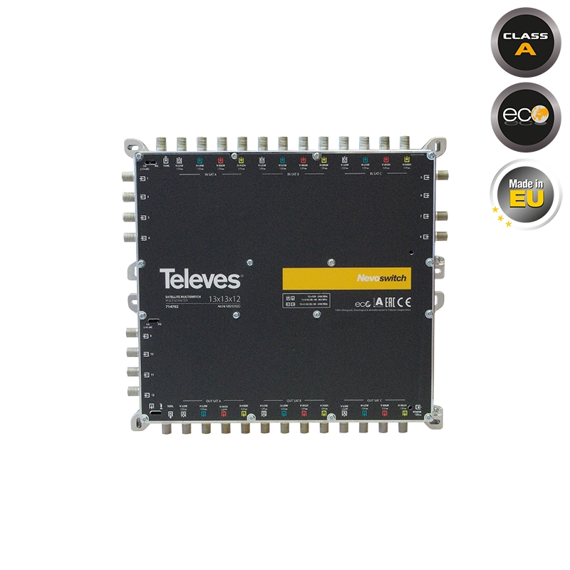 O 714702 NEVOSWITCH 13x13x12 ανήκει σε μιά νέα σειρά πολυδιακοπτών NEVOSWITCH της TELEVES. Με προσανατολισμό στον επαγγελματία και στην πλήρη ευελιξία της αρχικής εγκατάστασης αλλα και κάθε προγραμματισμένης ή απρογραμμάτιστης επέκτασης/προσθήκης, έχει την δυνατότητα να χρησιμοποιηθεί καί ως τερματικός και ώς διαδοχικός (cascadable). Μόνο με επιλογή 1 διακόπτη! Επιπλέον, το DC τροφοδοτεί μεσω Terr και προ-ενισχυτές, κεραίες B.O.S.S., κλπ. Διαθέτει διακόπτη +-10db για ρύθμιση ισχύος σήματος ενω η κατασκευή απο zamak παρέχει εξαιρετικό επίπεδο θωράκισης. Η σειρά NEVOSWITCH σχεδιάστηκε και λειτουργεί με σύστημα ECO το οποίο προσαρμόζει την κατανάλωση ανάλογα με το φορτίο της συσκευής, κάθε στιγμή, διατηρώντας πάντα την χαμηλότερη δυνατή κατανάλωση ανάλογα με τις συνθήκες λειτουργίας