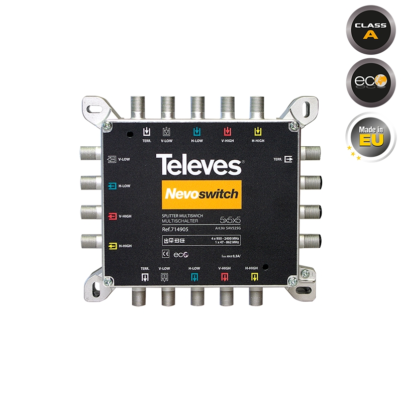 Το Televes 714905 Nevoswitch Splitter 5x5x5 4/4dB παρέχει πλήρη συνατότητα ρυθμίσεων για άριστη προσαρμογή σήματος. Κατασκευασμένο απο κράμα zamak προστατεύεται απο τις παρεμβολές και μπορεί να τοποθετηθεί σε διαδοχικές και τερματικές εγκαταστάσεις. Διαθέτει ανεξάρτητη ρύθμιση της στάθμης των εξόδων (εκτός των συμβατών με QUAD μονάδων). Χάρη στην λειτουργία ECO mode, η κατανάλωση ρεύματος προσαρμόζεται ανάλογα με το επίπεδο χρήσης.