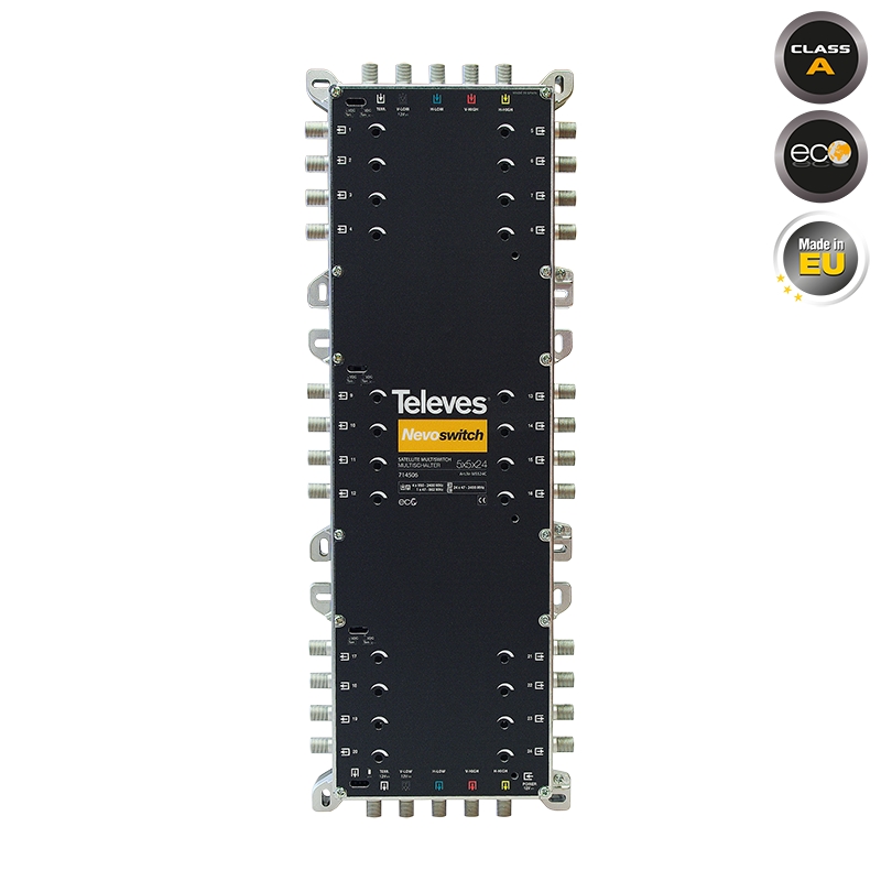 O 714506 NEVOSWITCH 5x5x24 ανήκει σε μιά νέα σειρά πολυδιακοπτών NEVOSWITCH της TELEVES. Με προσανατολισμό στον επαγγελματία και στην πλήρη ευελιξία της αρχικής εγκατάστασης αλλα και κάθε προγρμματισμένης ή απρογραμμάτιστης επέκτασης/προσθήκης, έχει την δυνατότητα να χρησιμοποιειθεί καί ως τερματικός και ώς διαδοχικός (cascadable). Μόνο με επιλογή 1 διακόπτη! Ευελιξία και στους τρόπους τροφοδοσίας: μέσω του Power DC Jack (12 Vdc) , μέσω του V-Low input (12 Vdc), μέσω των TERR input/οutput! Επιπλέον, δίνοντας 12 /18V σε οποιαδήποτε έξοδο, το DC τροφοδοτεί μεσω Terr και V-LOW input/output, προ-ενισχυτές, κεραίες B.O.S.S., LNB ή άλλους πολυδιακόπτες NEVOSWITCH, μέσω της επιλογής απο το Switch 1 (VDC). Η σειρά NEVOSWITCH σχεδιάστηκε και λειτουργεί με σύστημα ECO το οποίο προσαρμόζει την κατανάλωση ανάλογα με το φορτίο της συσκευής, κάθε στιγμή, διατηρώντας πάντα την χαμηλότερη δυνατή κατανάλωση ανάλογα με τις συνθήκες. Αν δέν είναι συνδεδεμένος κανένας χρήστης και δέν υπάρχει σύνδεση στα 220ν, η κατανάλωση θα πάει στα 0Α. Διαθέτει ανεξάρτητη ρύθμιση για κάθε έξοδο.