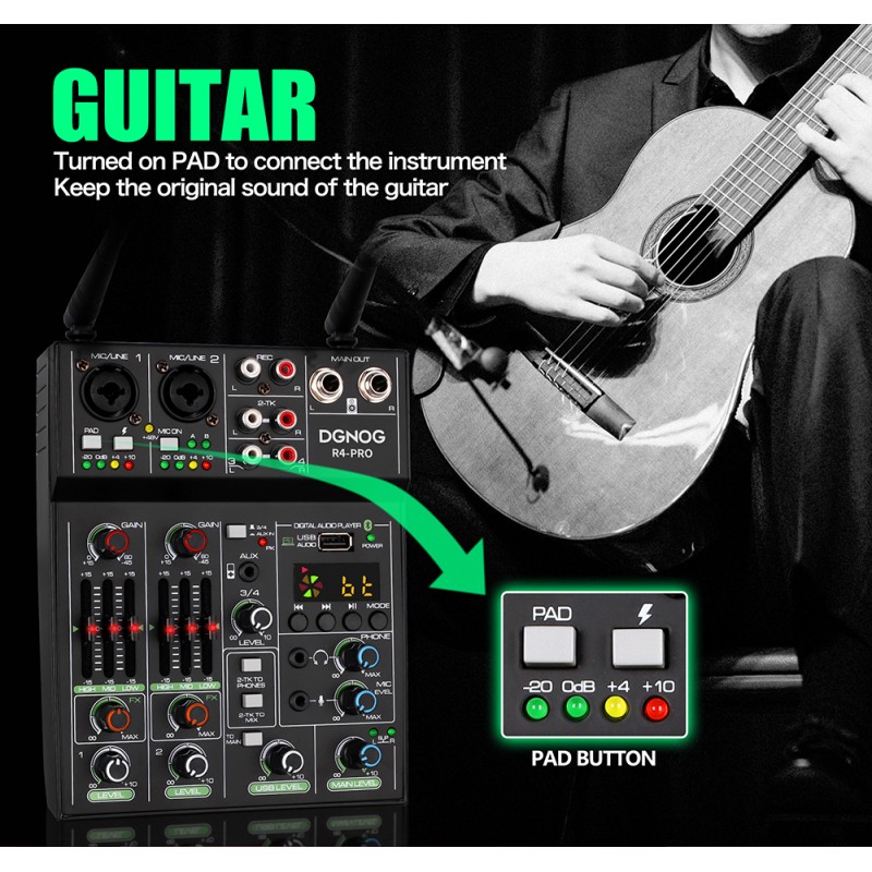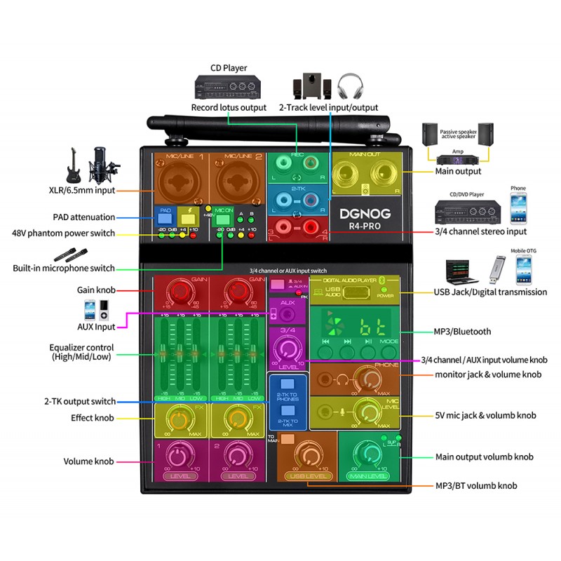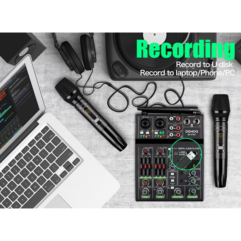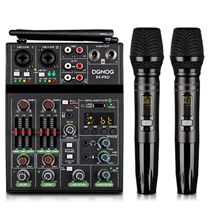 Built-in 2-channel wireless microphone】DGNOG R4-RRO Mixer Console with 2 UHF Frequency handheld microphones. A collection of microphones and mixers,microphone powered from 2 AA batteries and can work for 3-5 hours,and more convenient to use.CHA 576.1-590.1Mhz,CHB 560.1-574.1Mhz