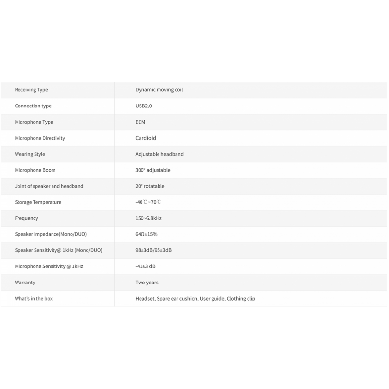 - What’s in the box :Headset, Spare ear cushion, User guide, Clothing clip