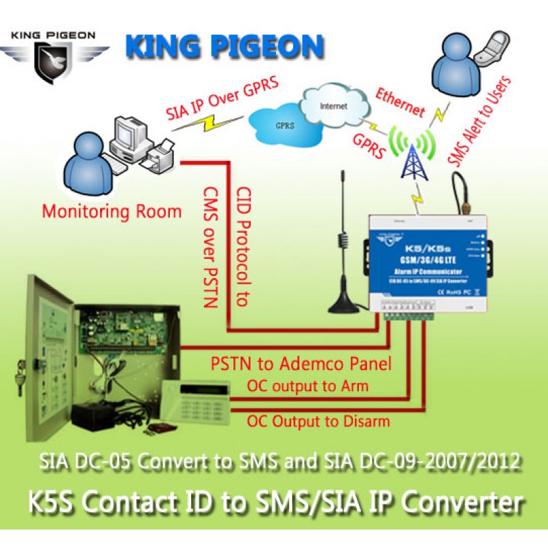 Το K5 GSM 3G Communicator μαζί με την κάρτα SIM μπορεί να μετατρέψει τα σήματα του συναγερμού από την τηλεφωνική γραμμή (Ademco Contact ID) σε ειδοποιητή SIA IP μέσω GPRS δικτύου και σύνδεση με τα κέντρα λήψης σημάτων.