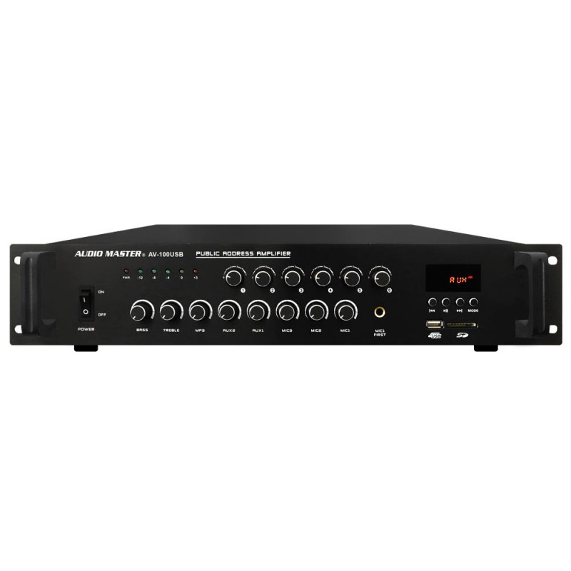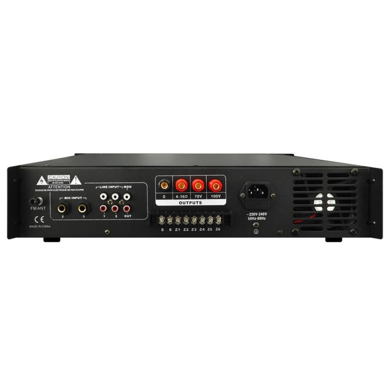 Μίκτης ενισχυτής 6 ζωνών με ισχύ 100W RMS & 5 εισόδους. Επιλογή λειτουργίας 100V/70V/4-16Ω. Ενσωματωμένο multimedia με Tuner FM, USB – SD card , MP3 media player & Bluetooth. Διαθέτει 3 εισόδους μικροφώνου και 2 εισόδους AUX. Διαθέτει έξοδο LINE-OUT. Το MIC1 μπορεί να λειτουργήσει με προτεραιότητα. Διαθέτει 6 ζώνες με ξεχωριστό έλεγχο έντασης για κάθε ζώνη. Ανεξάρτητη ρύθμιση έντασης ήχου για κάθε είσοδο. Ρυθμιστικά bass, treble και master volume. Ενισχυτής class AB, frequency response: 80Hz~18ΚHz. THD:<1%. Ανεμιστήρας υψηλής ταχύτητας. Protections: Short circuit, delayed on, thermal, overload, DC faults. Διαστάσεις (HxWxD) 88x482x360mm . Βάρος 8.50kg.