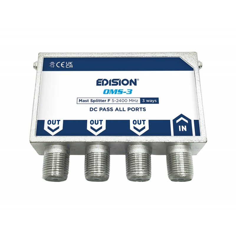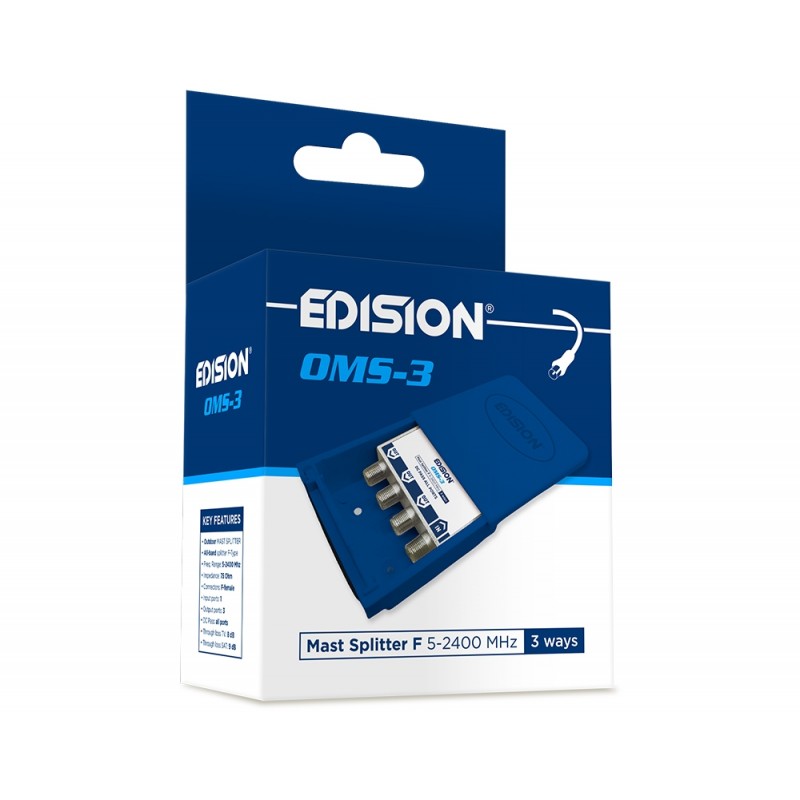 EDISION ΔΙΑΚΛΑΔΩΤΗΣ ΙΣΤΟΥ 3 ways F 5-2400Mhz OMS-3. Διαθέτει ειδικό κυτίο εγκατάστασης σε εξωτερικό χώρο, κατασκευασμένο απο συνθετικό υλικό, με πλήρως συρόμενη και αποσπώμενη πρόσθια πλευρά, καθώς και με κινητό και αποσπώμενο σημείο εισόδου και διαχείρησης καλωδίων. Στην πίσω πλευρά διαθέτει διάταξη δαγκάνας και πολλαπλές θέσεις στερέωσης με δεματικό (περιέχεται) αλλά και έτοιμες αναμονές για στερέωση με ούπα και βίδες (περιέχονται). Εντός του κυτίου υπάρχει, με διάταξη ανάκλισης, διακλαδωτής "All-band" τηλεοπτικού σηματος με φις τύπου F θηλυκά και χυτό, μονοκόμματο, επινικελωμένο κέλυφος ψευδαργύρου. Είναι σχεδιασμένο και κατασκευασμένο με υψηλά πρότυπα απόδοσης, προσφέροντας χαμηλές απώλειες διέλευσης, υψηλή απομόνωση μεταξύ των εξόδων και μπορεί να χρησιμοποιηθεί σε όλες τις τηλεοπτικές εγκαταστάσεις τόσο με Επίγειο Ψηφιακό, όσο και με Δορυφορικό σήμα (σύμφωνα με τις επιλογές του τεχνικού της εγκατάστασης). Διαθέτει 1 είσοδο και 3 εξόδους για διαμοιρασμό σήματος απο το δίκτυο ομοαξονικού καλωδίου, μαζί με διέλευση ρεύματος DC απο όλες τις εξόδους προς την είσοδο, διευκολύνοντας τον τεχνικό σε εγκαταστάσεις δορυφορικής τηλεόρασης και επίσης όταν χρειάζεται πέρασμα ρεύματος DC προς κεραίες, για παράδειγμα, με ενεργό δίπολο ή προς ενισχυτές ιστού.