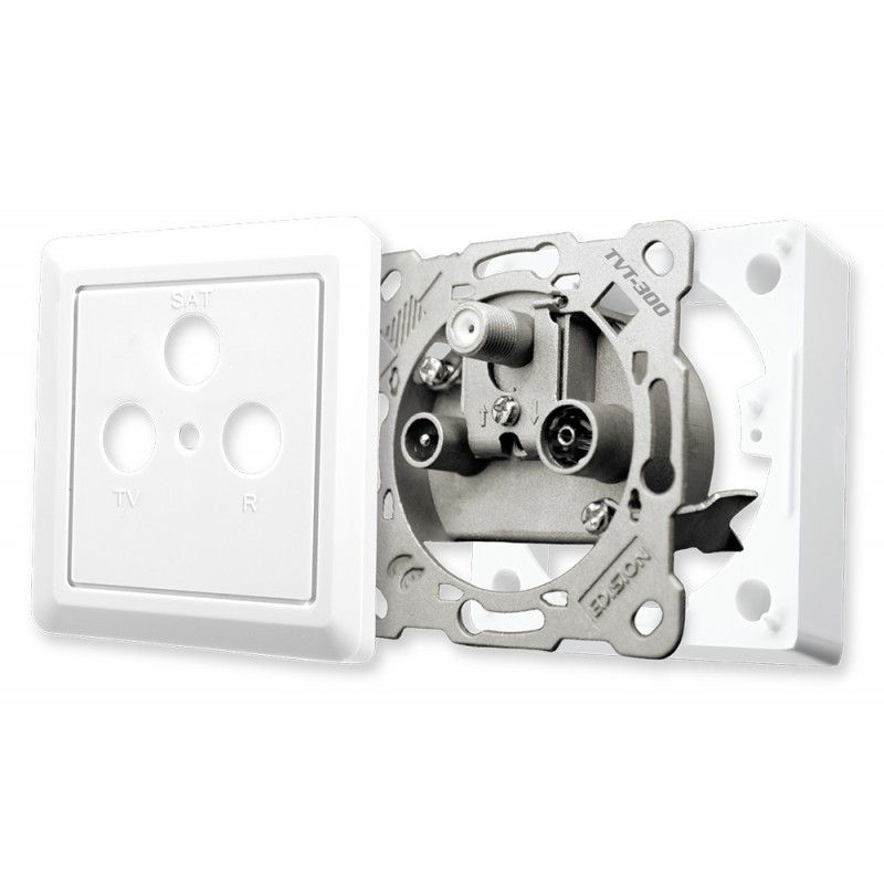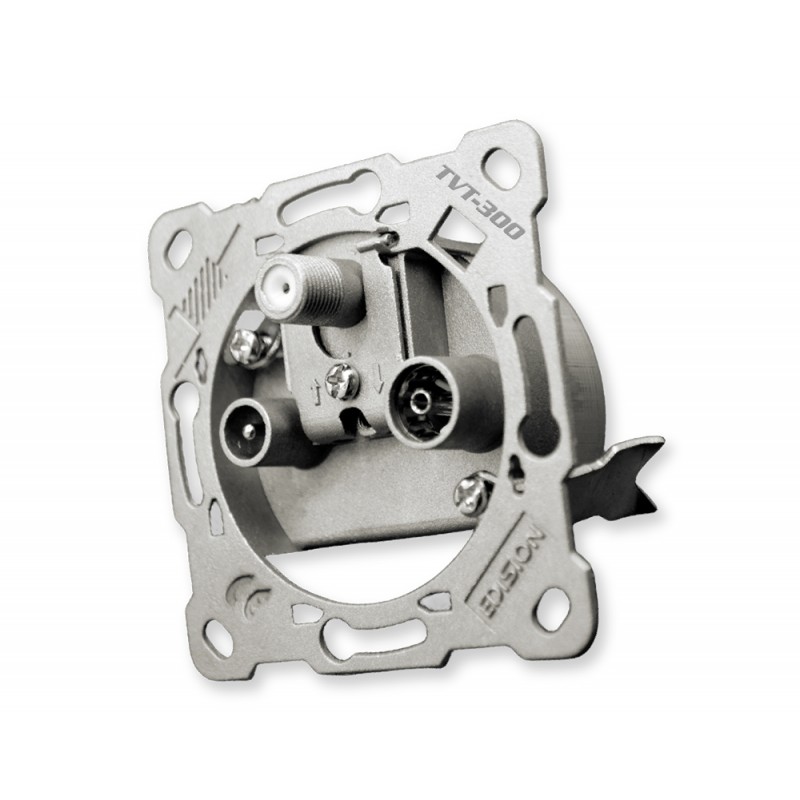 Το EDISION TVΚ-800, είναι πλήρες ΚΙΤ με 3ΠΛΗ πρίζα Διελεύσεως Δορυφορικού, Επίγειου Ψηφιακού Τηλεοπτικού και Ραδιοφωνικού σήματος και μαζί πρόσοψη της πρίζας αλλά και πλαίσιο επιτοίχιας στερέωσης. Η πρίζα είναι κατασκευασμένη από χυτό, ειδικό κράμα μετάλλου σε συνδυασμό με εξαιρετικής ποιότητας ηλεκτρονικά και μηχανικά μέρη. Παρέχει πλήρως ανεξάρτητη διέλευση τηλεοπτικού (Δορυφορικό και Επίγειο) και ραδιοφωνικού σήματος προς ένα σημείο τηλεόρασης και ταυτόχρονα, διέλευση σήματος προς επόμενο σημείο τηλεόρασης όπου θα βρίσκεται ίδια ή τερματική πρίζα, σύμφωνα με την επιλογή του τεχνικού. Διαθέτει σημείο γείωσης, επιλεγόμενα σημεία στήριξης στο εντοιχισμένο ή επίτοιχο κυτίο, καθώς και 2 σημεία αγκύρωσης σε εντοιχισμένο κυτίο. Το ειδικό σημείο αγκύρωσης των ομοαξονικών καλωδίων με το σήμα, διαθέτει ειδική υποδοχή για αυτά καθώς και χυτό μεταλλικό κάλυμμα από το ίδιο κράμα της πρίζας, για σίγουρη στερέωση αλλά και για ηλεκτρομαγνητική θωράκιση της σύνδεσης. Τα 2 αποσπώμενα αξεσουάρ (πρόσοψη και πλαίσιο επιτοίχιας στερέωσης), είναι κατασκευασμένα από ειδικό συνθετικό υλικό, και συμπληρώνουν την εξαιρετικής ποιότητας 3πλη πρίζα TV-R-SAT, ώς ολοκληρωμένη εφαρμογή στο σημείο της τηλεόρασης.