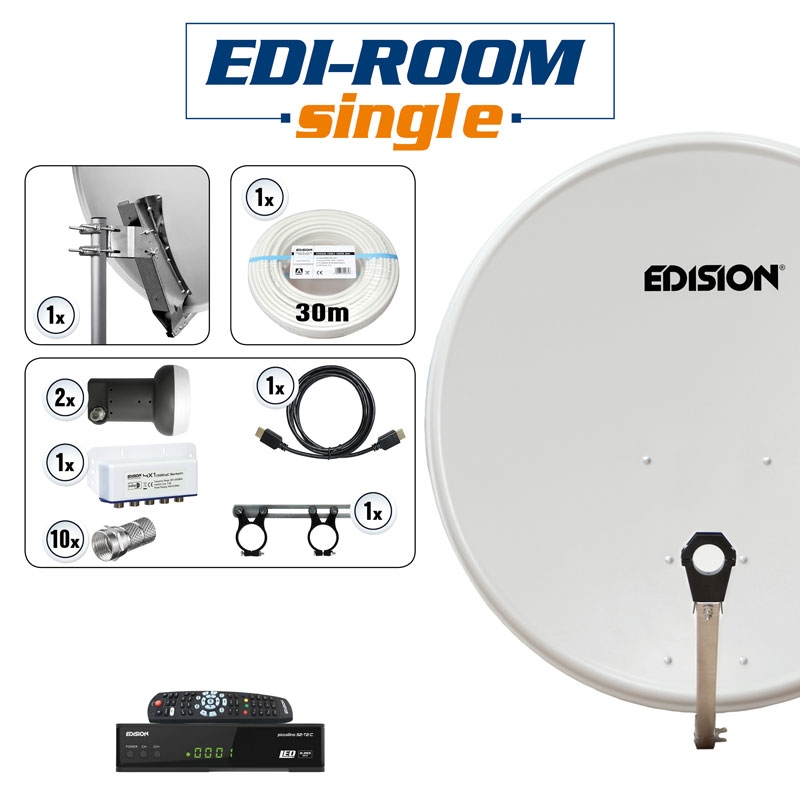 Το τηλεοπτικό πακέτο EDI-ROOM single για ένα σημείο TV, λαμβάνει ~350 Ελεύθερα Δορυφορικά Τηλεοπτικά κανάλια* και ~150 Ελεύθερα Δορυφορικά Ραδιοφωνικά κανάλια*, ήδη επιλεγμένα και προ-συντονισμένα μέσα στον combo δέκτη PICCOLLINO S2+T2/C, ο οποίος συνοδεύεται απο τηλεχειριστήριο 2-σε-1 για δέκτη και 5 βασικές λειτουργίες της TV Πρόκειται για κανάλια απο τους δημοφιλείς δορυφόρους Astra 19,2Ε και Hotbird 13Ε, χωρισμένα στα Favorites ανά χώρα. Το πακέτο διατίθεται ως ολοκληρωμένη λύση, με υλικά εγκατάστασης και σύνδεσης για τον τεχνικό και τον χρήστη αλλα και με προγραμματισμένο combo δέκτη, αποτελώντας την ιδανική επιλογή για μονάδες ενοικιαζόμενων δωματίων, ηλεκτρονικές πλατφόρμες βραχυχρόνιας μίσθωσης κατοικιών, καταστήματα και μόνιμες ή εξοχικές κατοικίες!