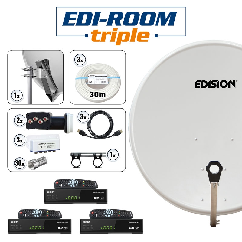 Το τηλεοπτικό πακέτο EDI-ROOM triple για τρία σημεία TV, λαμβάνει ~350 Ελεύθερα Δορυφορικά Τηλεοπτικά κανάλια* και ~150 Ελεύθερα Δορυφορικά Ραδιοφωνικά κανάλια*, ήδη επιλεγμένα και προ-συντονισμένα μέσα στους combo δέκτες PICCOLLINO S2+T2/C, οι οποίοι συνοδεύονται απο τηλεχειριστήριο 2-σε-1 για δέκτη και 5 βασικές λειτουργίες της TV. Πρόκειται για κανάλια απο τους δημοφιλείς δορυφόρους Astra 19,2Ε και Hotbird 13Ε, χωρισμένα στα Favorites ανά χώρα. Το πακέτο διατίθεται ως ολοκληρωμένη λύση, με υλικά εγκατάστασης και σύνδεσης για τον τεχνικό και τον χρήστη αλλα και με προγραμματισμένους τους combo δέκτες, αποτελώντας την ιδανική επιλογή για μονάδες ενοικιαζόμενων δωματίων, ηλεκτρονικές πλατφόρμες βραχυχρόνιας μίσθωσης κατοικιών, καταστήματα και μόνιμες ή εξοχικές κατοικίες!