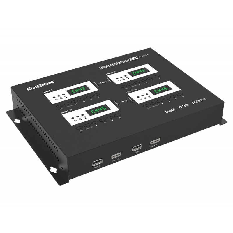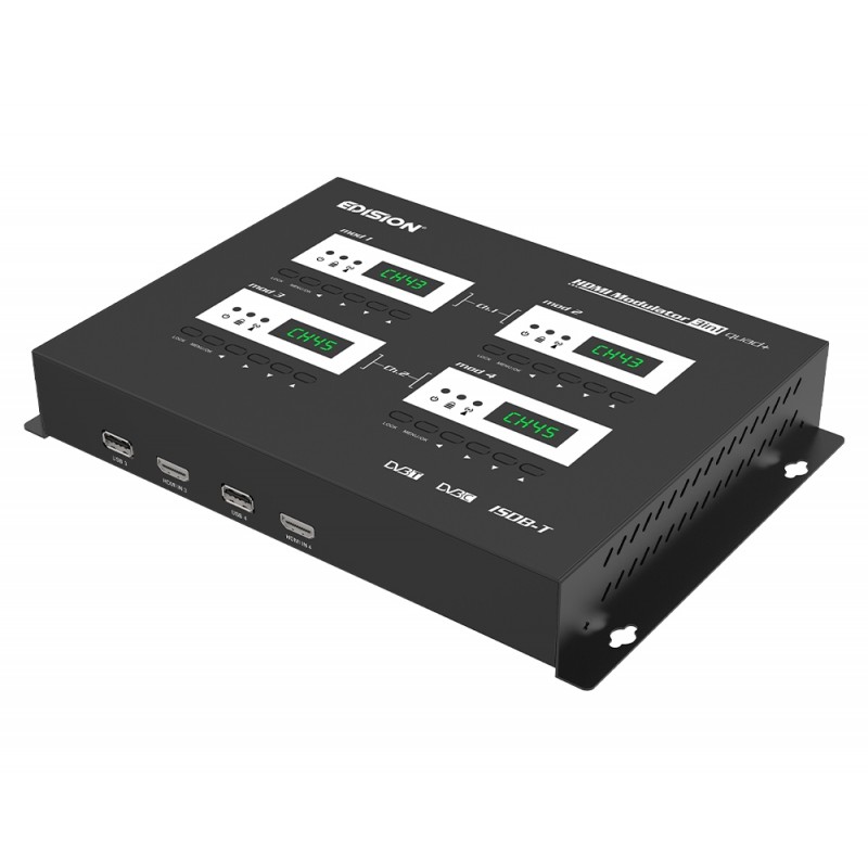 Ψηφιακός 4-κάναλος HDMI διαμορφωτής EDISION, με 2 κανάλια εξόδου επίγειου ψηφιακού DVB-T/ISDB-T ή καλωδιακού DVB-C, VHF/UHF MPEG4 σήματος, σε μια RF έξοδο. Διαθέτει έτοιμες και πολύ εύκολες ρυθμίσεις για κάθε τύπο εγκατάστασης. Από κάθε 1 έως και 4 συσκευές με HDMI έξοδο (δέκτες δορυφορικού & επίγειου ψηφιακού τηλεοπτικού σήματος, κάμερες, DVD, DVR, Digital Signage και κάθε άλλη πηγή-συσκευή εξόδου σήματος HDMI) παράγει στις 2 εξόδους του MPEG4 ΕΠΙΓΕΙΟ ΨΗΦΙΑΚΟ σήμα DVB-T/ISDB-T ή ΚΑΛΩΔΙΚΟ DVB-C σήμα έως FULL HD 1080p 60FPS, με επιλογή εξόδου σε μπάντα VHF ή UHF. Παρέχει εξαιρετική ποιότητα σήματος από τις 2 εξόδους του, σε συνδυασμό με αξιόπιστη λειτουργία και σταθερή απόδοση, σε κάθε διάταξη εγκατάστασης. Διαθέτει 4 x USB θύρες για λειτουργία CONFIG DATA της κάθε μίας από τις τέσσερις μονάδες του. H ΛΕΙΤΟΥΡΓΙΑ FAST PRE-CONFIG, παρέχει 50 ΕΤΟΙΜΑ ΕΠΙΛΕΓΟΜΕΝΑ ID, για πολύ εύκολο προγραμματισμό. Η ρύθμιση των 4 ID της κάθε 4-κανάλης μονάδας, γίνεται ανά κανάλι σε κάθε ένα από τα 4 Display/Mod ξεχωριστά και η ρύθμιση των 2 καναλιών εξόδου από τα Modulator Display 1 & 3.
