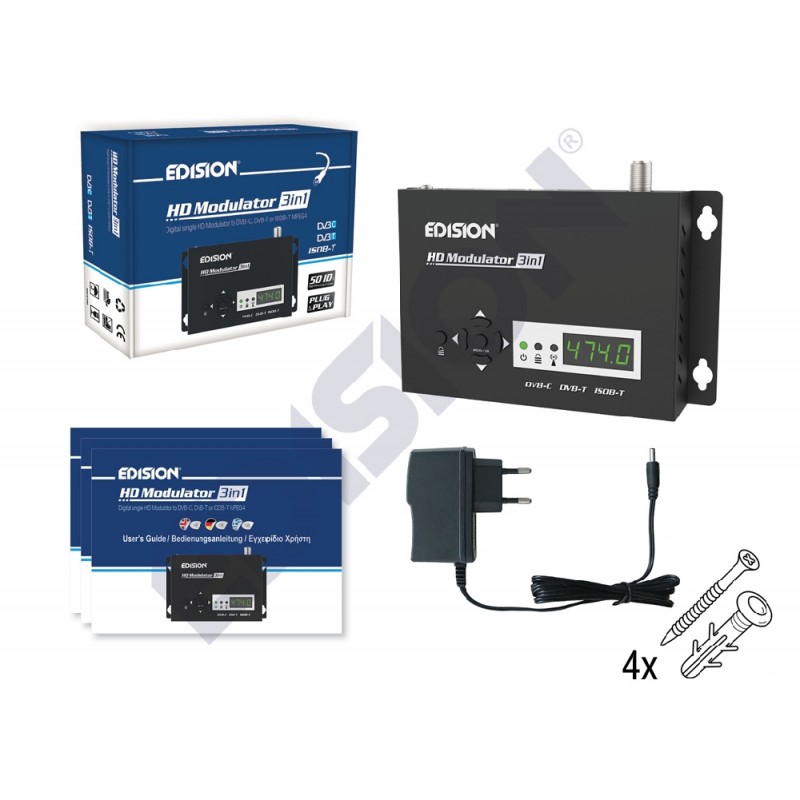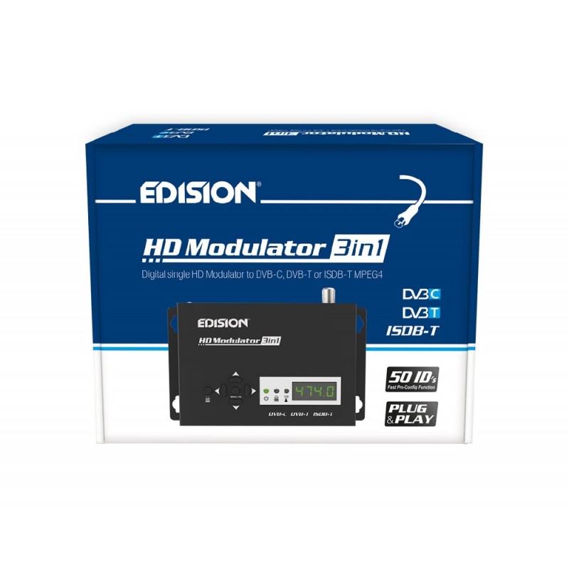 Ψηφιακός, 3in1 μονοκάναλος FULL HIGH DEFINITION διαμορφωτής με 3 ΕΠΙΛΕΓΟΜΕΝΑ σήματα διαμόρφωσης (DVB-C, DVB-T & ISDB-T). Με είσοδο από μία οποιαδήποτε πηγή HDMI (Επίγειους & Δορυφορικούς αποκωδικοποιητές, κάμερες, DVD, DVR κ.ά.) διαμορφώνει και παράγει επιλογή από ΤΡΙΑ (3) σήματα εξόδου: DVB-C, DVB-T & ISDB-T, ανάλογα με το σήμα της εγκατάστασης, με απλή ρύθμιση από το DISPLAY. Προσφέρει υψηλή ανάλυση εξόδου έως 1080p@30FPS και διαθέτει οθόνη LED 4 ψηφίων με 6 πλήκτρα. Με εύκολη και γρήγορη εγκατάσταση PLUG & PLAY και ταχεία ρύθμιση με την λειτουργία Fast Pre-Config μεταξύ 50 επιλέξιμων IDs για απόλυτη ευελιξία χρήσης, σύμφωνα με το σήμα της εγκατά-