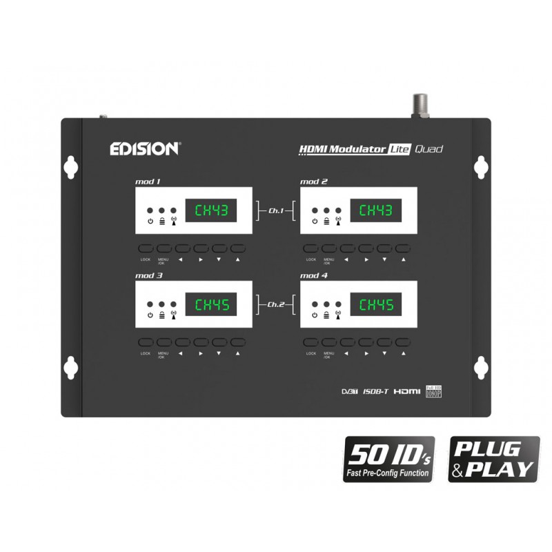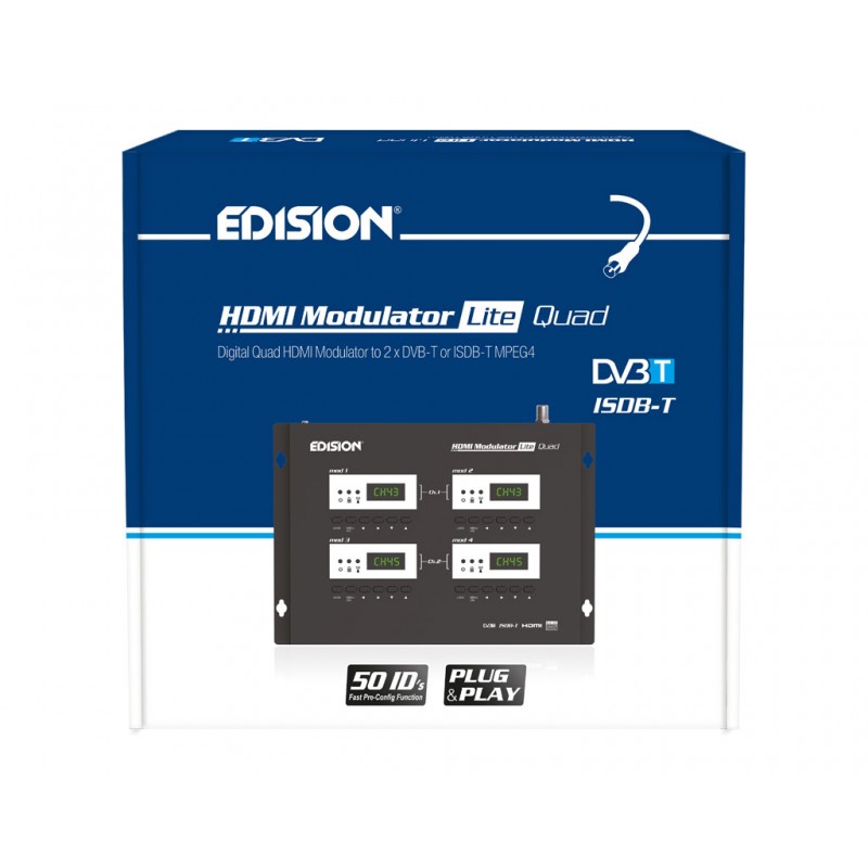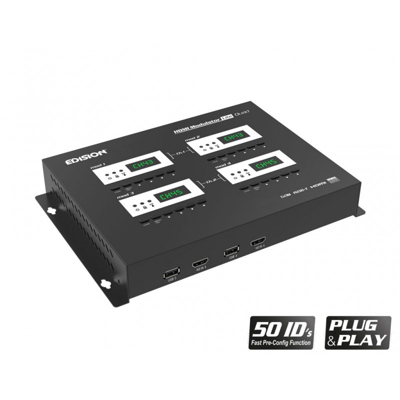 Ψηφιακός 4-κάναλος HDMI διαμορφωτής EDISION, με 2 εξόδος Επίγειου ψηφιακού DVB-T/ISDB-T, VHF/UHF MPEG4 σήματος. Διαθέτει έτοιμες και πολύ εύκολες ρυθμίσεις για κάθε τύπο εγκατάστασης. Απο κάθε 1 έως και 4 συσκευές με HDMI έξοδο (δέκτες δορυφορικού & επίγειου ψηφιακού τηλεοπτικού σήματος, κάμερες, DVD, DVR, Digital Signage και κάθε άλλη πηγή-συσκευή εξόδου σήματος HDMI) παράγει στις 2 εξόδους του MPEG4 ΕΠΙΓΕΙΟ ΨΗΦΙΑΚΟ σήμα DVB-T/ISDB-T έως FULL HIGH DEFINITION 1080p, με επιλογή εξόδου σε μπάντα VHF ή UHF. Παρέχει εξαιρετική ποιότητα σήματος απο τις 2 έξοδους του, σε συνδυασμό με αξιόπιστη λειτουργία και σταθερή απόδοση, σε κάθε διάταξη εγκατάστασης. Διαθέτει 4 x USB θύρες για λειτουργία CONFIG DATA της κάθε μίας απο τις τέσσερις μονάδες του. H ΛΕΙΤΟΥΡΓΙΑ FAST PRE-CONFIG, παρέχει 50 ΕΤΟΙΜΑ ΕΠΙΛΕΓΟΜΕΝΑ ID, για πολύ εύκολο προγραμματισμό. Η ρύθμιση των 4 ID της κάθε 4-κανάλης μονάδας, γίνεται ανα κανάλι σε κάθε ένα απο τα 4 Display/Mod ξεχωριστά και η ρύθμιση των 2 καναλιών εξόδου απο τα Modulator Display 1 & 3.