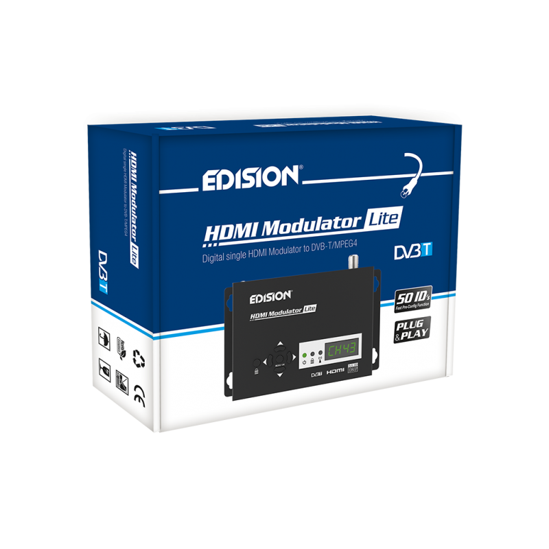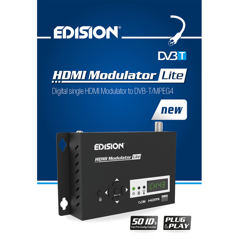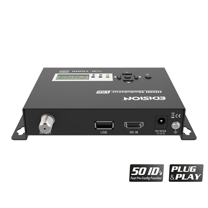 - Ψηφιακός μονοκάναλος HDMI διαμορφωτής, με λειτουργία FAST PRE-CONFIG (50 έτοιμα και επιλεγόμενα ID) και επιπλέον λειτουργία CONFIG DATA (εξαγωγή σε USB, εύκολη μεταφόρτωση στο Modulator)