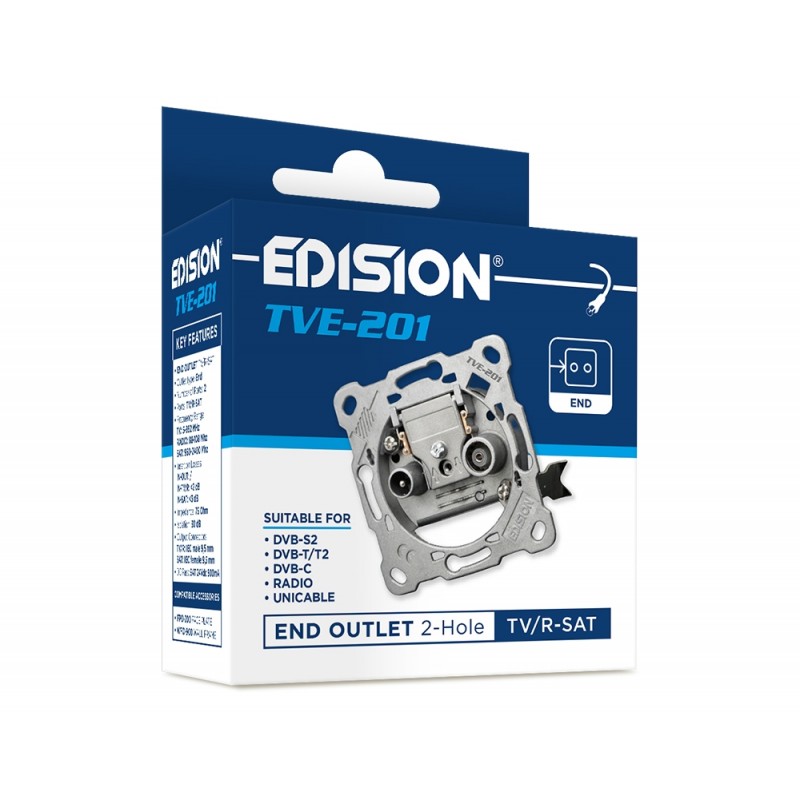 H EDISION TVΕ-201, είναι πρίζα Τερματική Δορυφορικού, Επίγειου Ψηφιακού Τηλεοπτικού και Ραδιοφωνικού σήματος. Είναι κατασκευασμένη απο χυτό, ειδικό κράμα μετάλλου σε συνδυασμό με εξαιρετικής ποιότητας ηλεκτρονικά και μηχανικά μέρη. Παρέχει Τερματισμό Δορυφορικού και Επίγειου τηλεοπτικού σήματος καθώς και ραδιοφωνικού FM σε ένα ανεξάρτητο σημείο τηλεόρασης ή μετά απο πρίζα διέλευσης σήματος προς επόμενο σημείο τηλεόρασης, σύμφωνα με την επιλογή του τεχνικού. Διαθέτει σημείο γείωσης, επιλεγόμενα σημεία στήριξης στο εντοιχισμένο ή επίτοιχο κυτίο, καθώς και 2 σημεία αγκύρωσης σε εντοιχισμένο κυτίο. Το ειδικό σημείο αγκύρωσης των ομοαξονικών καλωδίων με το σήμα, διαθέτει ειδική υποδοχή για αυτά καθώς και χυτό μεταλλικό κάλυμμα απο το ίδιο κράμα της πρίζας, για σίγουρη στερέωση αλλά και για ηλεκτρομαγνητική θωράκιση της σύνδεσης.
