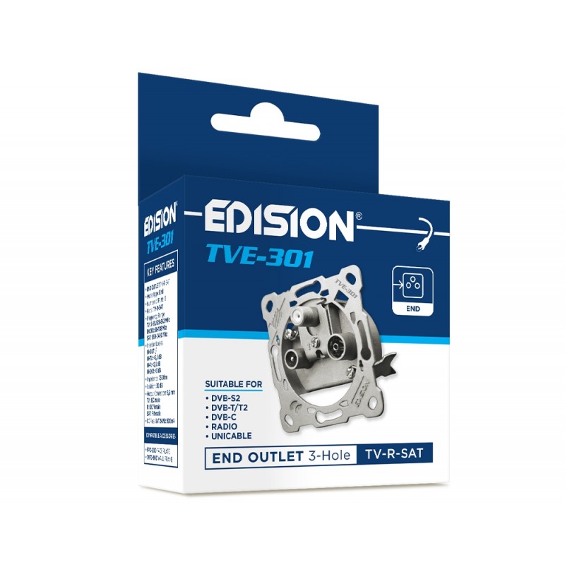 H EDISION TVE-301, είναι 3ΠΛΗ πρίζα Τερματική Δορυφορικού, Επίγειου Ψηφιακού Τηλεοπτικού και Ραδιοφωνικού σήματος. Είναι κατασκευασμένη από χυτό, ειδικό κράμα μετάλλου σε συνδυασμό με εξαιρετικής ποιότητας ηλεκτρονικά και μηχανικά μέρη. Παρέχει πλήρως ανεξάρτητη παροχή τηλεοπτικού (Δορυφορικό και Επίγειο) και ραδιοφωνικού σήματος, προς ένα τερματικό σημείο τηλεόρασης, σύμφωνα με την επιλογή του τεχνικού. Διαθέτει σημείο γείωσης, επιλεγόμενα σημεία στήριξης στο εντοιχισμένο ή επίτοιχο κυτίο, καθώς και 2 σημεία αγκύρωσης σε εντοιχισμένο κυτίο. Το ειδικό σημείο αγκύρωσης των ομοαξονικών καλωδίων με το σήμα, διαθέτει ειδική υποδοχή για αυτά καθώς και χυτό μεταλλικό κάλυμμα από το ίδιο κράμα της πρίζας, για σίγουρη στερέωση αλλά και για ηλεκτρομαγνητική θωράκιση της σύνδεσης.