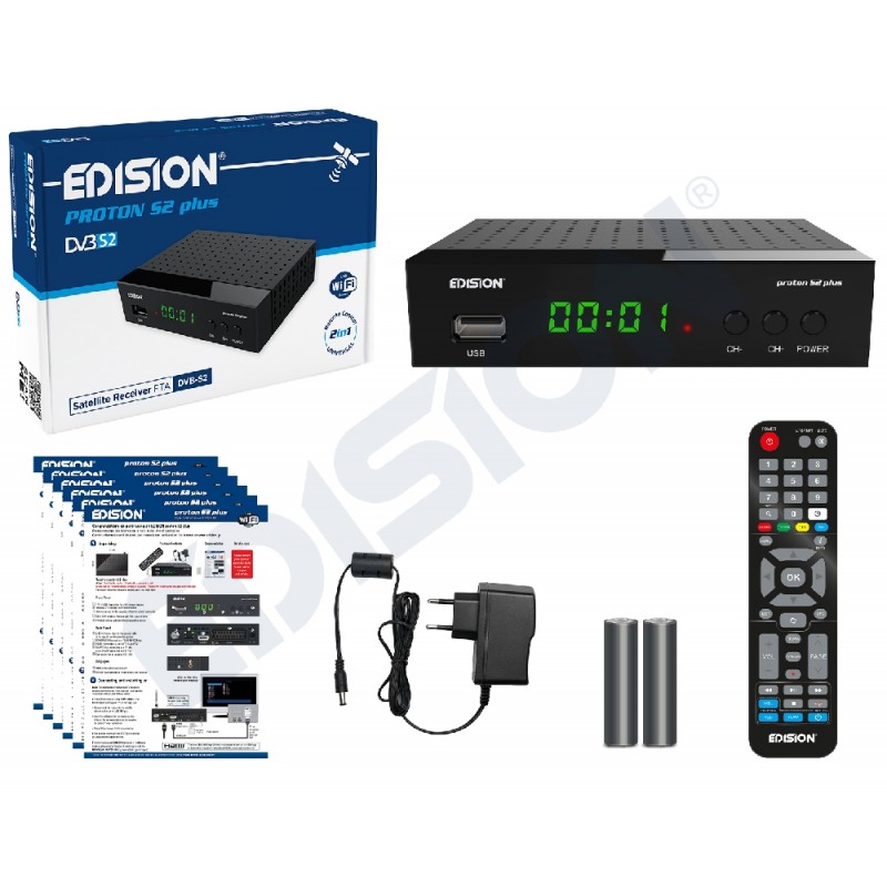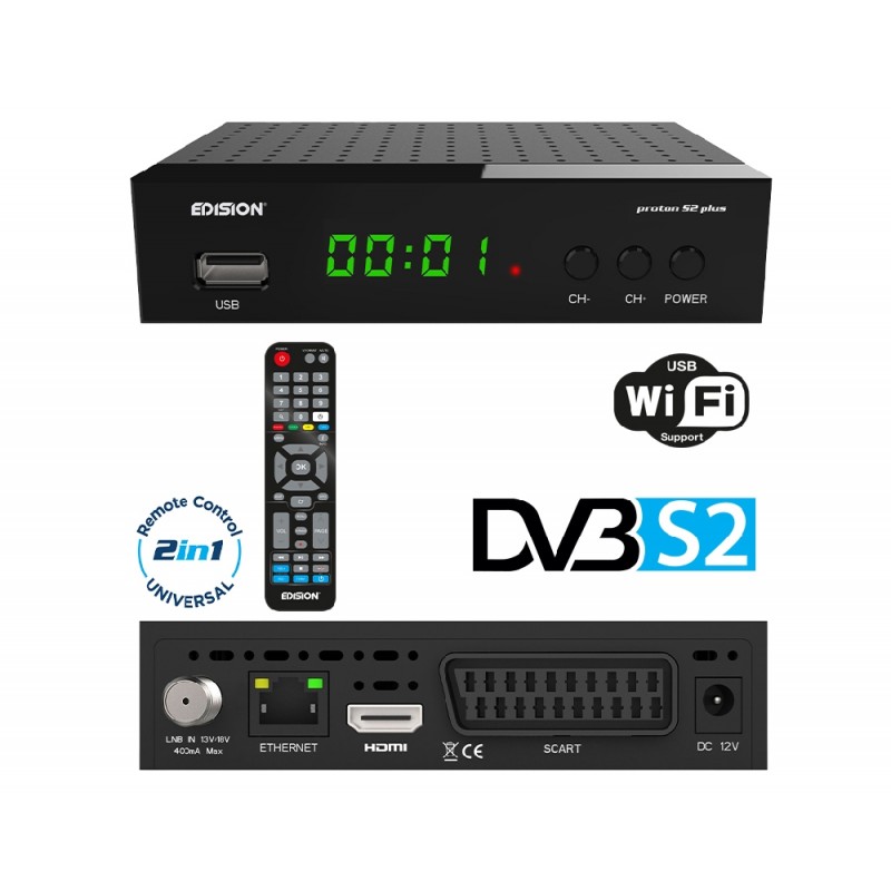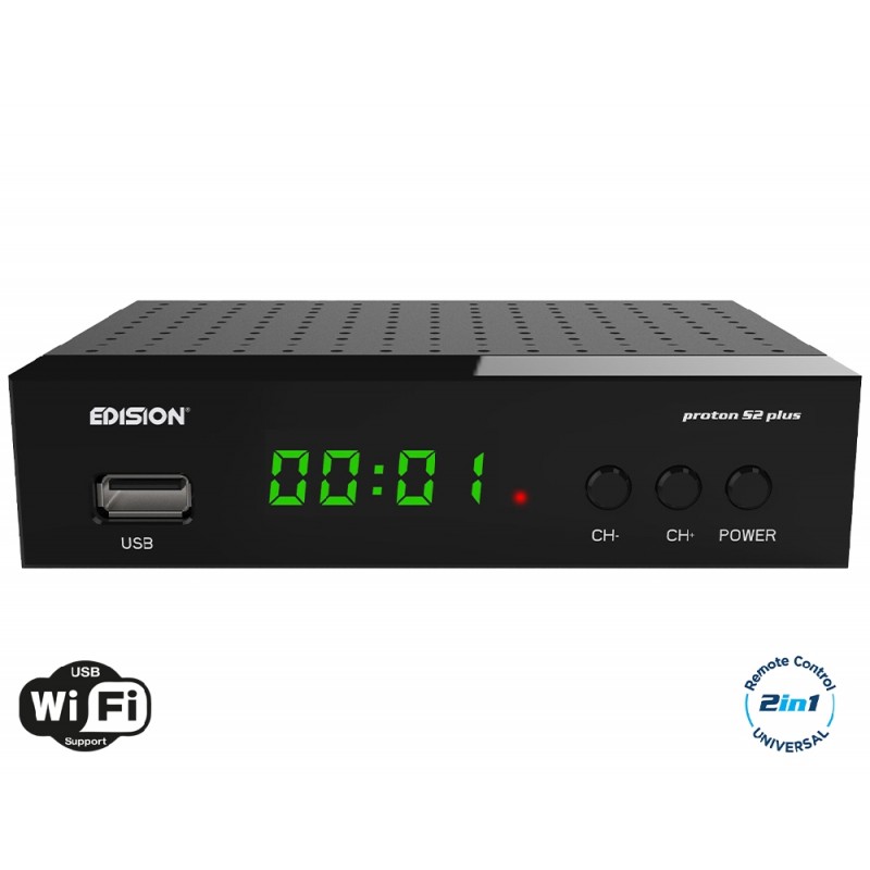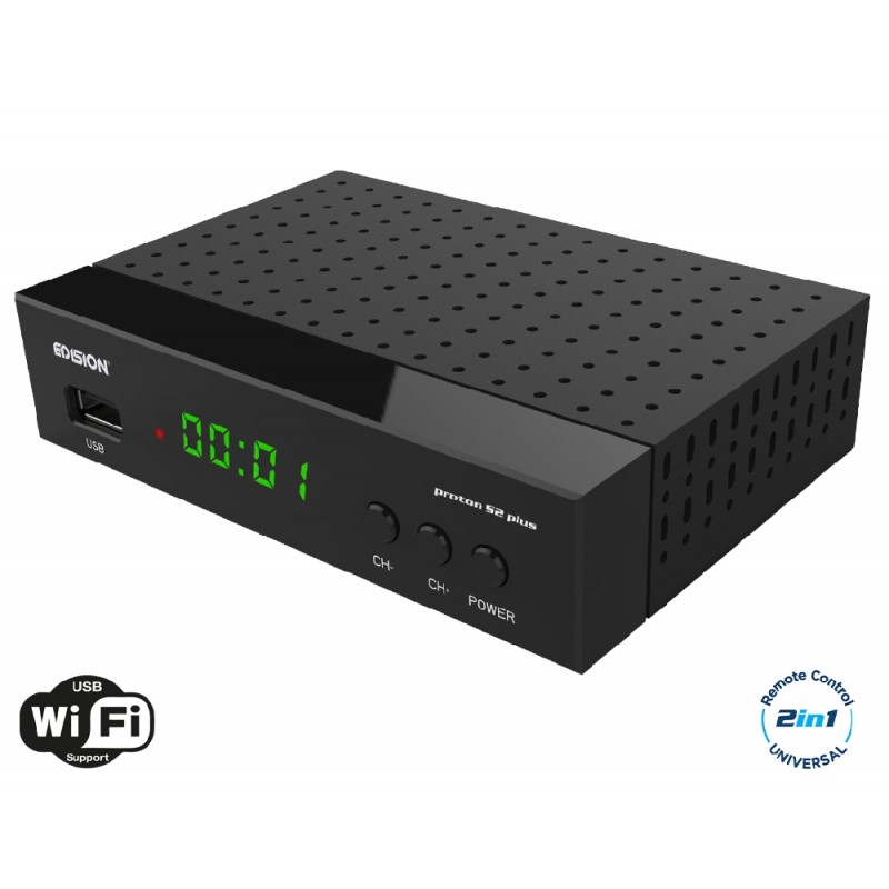 Ο ΡRΟΤΟΝ S2 plus είναι ο νέος Δορυφορικός δέκτης της EDISION με δυνατότητα θέασης DVB-S & DVB-S2 δορυφορικών καναλιών. Με αναβαθμισμένο OSD MENU και νέας γενιάς επεξεργαστή, σας προσφέρει ταχύτατη εναλλαγή στο μενού και στα κανάλια, ενώ διαθέτει αποθηκευτική ικανότητα έως 6000 καναλιών. Η λειτουργία USB WiFi support MTK7601 και η Θύρα Ethernet, σας προσφέρει πρόσβαση σε web εφαρμογές και μαζί με τις λειτουργίες Media Player που διαθέτει. Έρχεται με εργονομικό και αναβαθμισμένο Universal Τηλεχειριστήριο 2-σε-1 EDI-RCU 4 learn, με τα μεγάλα πλήκτρα, για χειρισμό του δέκτη και τεσσάρων (4) λειτουργιών LG/SAMSUNG(*) τηλεοράσεων, οι οποίες λειτουργίες είναι και ελεύθερα προγραμματιζόμενες! Όλα αυτά, για ακόμα πιο διασκεδαστική και απολαυστική χρήση των πολλών, αγαπημένων σας λειτουργιών. Συνοδεύεται από την εγγύηση και την υποστήριξη της EDISION.