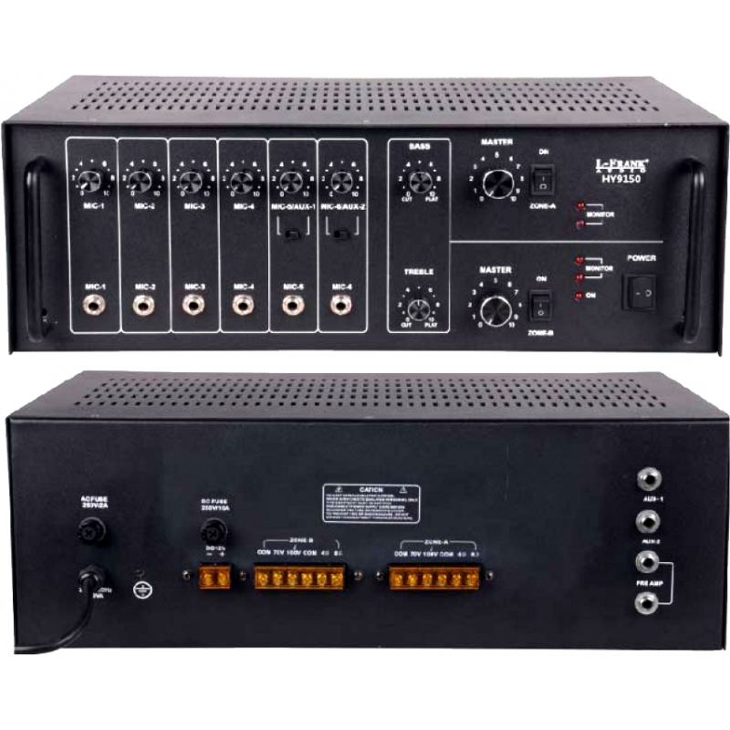 Ενισχυτής Public Address 100V ή 70V στα 4 ή στα 8Ω, 2 ανεξάρτητες ζώνες, 2x75W RMS με 6 εισόδους για μικρόφωνα και μία είσοδο LINE IN.