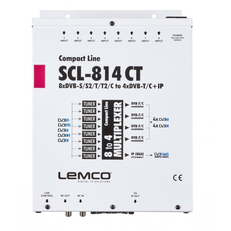 Το SCL-814CT είναι ένα πολύ ισχυρό επαγγελματικό headend, ικανό να δέχεται έως και 8 ανεξάρτητες δορυφορικές(DVB-S/S2), επίγειες (DVB-T/T2) ή καλωδιακές (DVB-C) εισόδους και τις μετατρέπει σε 4 x DVB-T/C RF κανάλια εξόδου με ταυτόχρονη διανομή των προγραμμάτων σε IP μέσω Gbit IP streaming. Υποστηρίζει τεχνολογία “pool” που σημαίνει ότι ο χρήστης μπορεί να διαλέξει οποιοδήποτε πρόγραμμα από οποιαδήποτε από τις 8 εισόδους και να το αναθέσει σε οποιαδήποτε από τις 4 RF + IP εξόδους, προσφέροντας μεγάλη ευελιξία.