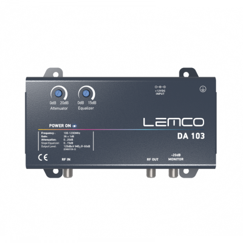 Ο DA103 της Lemco είναι ένας ενισχυτής ευρείας ζώνης με απολαβή 36dB και στάθμη εξόδου RF 120dBuV. Ο ενισχυτής προσφέρει εξαιρετική απόδοση και γραμμικότητα ραδιοσυχνοτήτων, ενώ η μεταλλική θήκη του παρέχει στιβαρό σχεδιασμό και εξαιρετική ηλεκτρομαγνητική θωράκιση.
