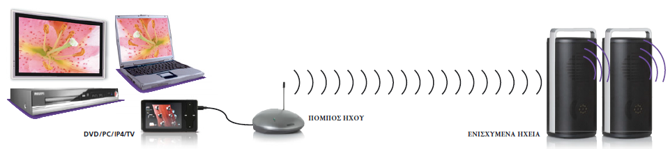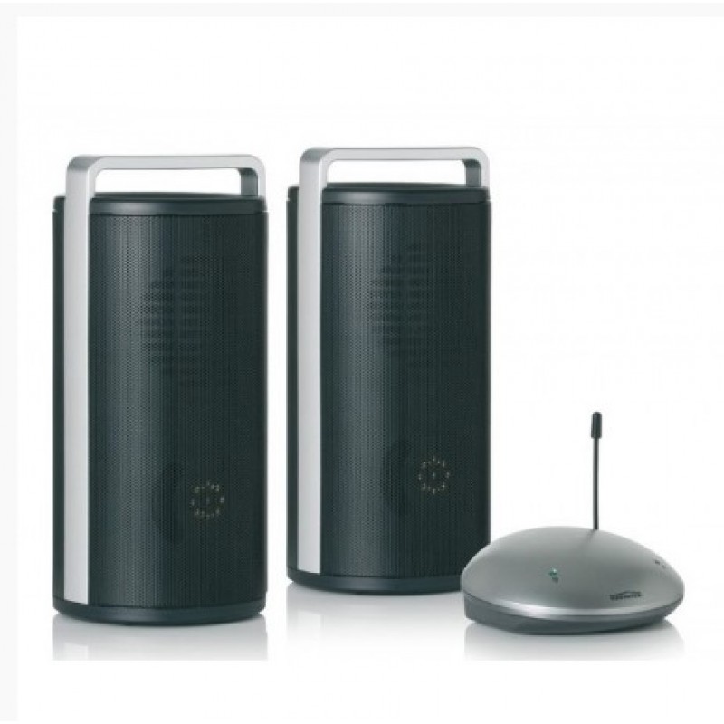 Το σετ αποτελείται από ένα πομπό και δύο ηχεία. Μπορείτε να συνδέσετε τον πομπό με την πηγή ήχου (για παράδειγμα, DVD player). Στη συνέχεια μπορείτε να απολαύσετε την αγαπημένη σας μουσική παντού μέσα και γύρω από το σπίτι σας ασύρματα μέσω των φορητών ηχείων.