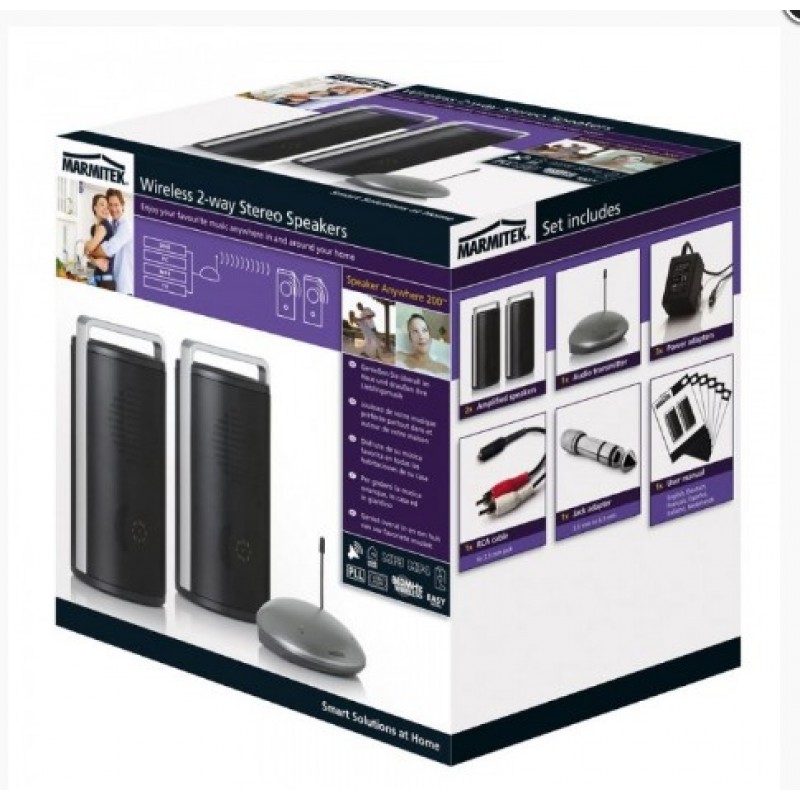 Το Marmitek Speaker Anywhere 200 είναι ένα ασύρματο 863MHz στερεοφωνικό σύστημα ηχείων που μπορεί εύκολα να συνδεθεί με τις πηγές ήχου (ραδιόφωνο, τηλεόραση, HiFi και CD- / MP3-/ MP4-/ DVD-player). Με αυτό τον τρόπο, μπορείτε να απολαύσετε τη μουσική της πηγής ήχου οπουδήποτε μέσα και γύρω από το σπίτι.