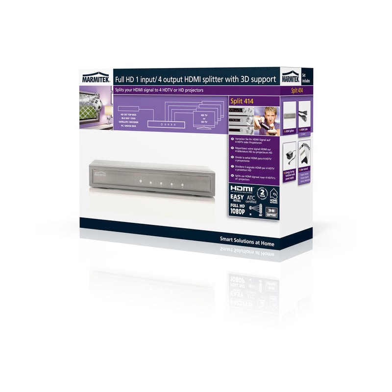 Στο Marmitek Split 414 μπορείτε να συνδέσετε 4 οθόνες (HD τηλεόραση ή HD προτζέκτορα) και να διαχωρίσετε το HDMI σήμα από μία πηγή (Blu-ray Player, HD set-top box, PlayStation 3, Xbox 360, κλπ). Σε αντίθεση με τα παθητικά HDMI splitters, αυτό γίνεται χωρίς καμία απώλεια σήματος ή κρυπτογράφησης και διατηρώντας την βέλτιστη ποιότητα εικόνας. Είναι επίσης ιδανικό για χρήση σε συνδυασμό με ένα HDMI extender (π.χ. σε ένα άλλο δωμάτιο). Τα Split 412/414 υποστηρίζουν Full HD 1080p και 3D (έτσι είναι κατάλληλα για χρήση με το δικό σας 3D εξοπλισμός).