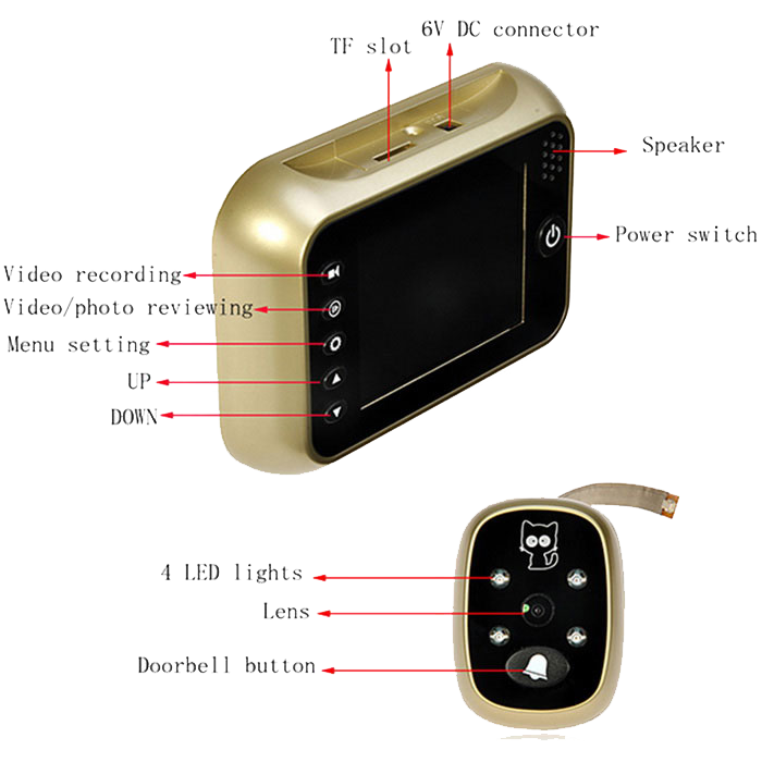 • 6. Photo taking: Automatically taking and saving photos on Micro SD card when visitor press doorbell button.
