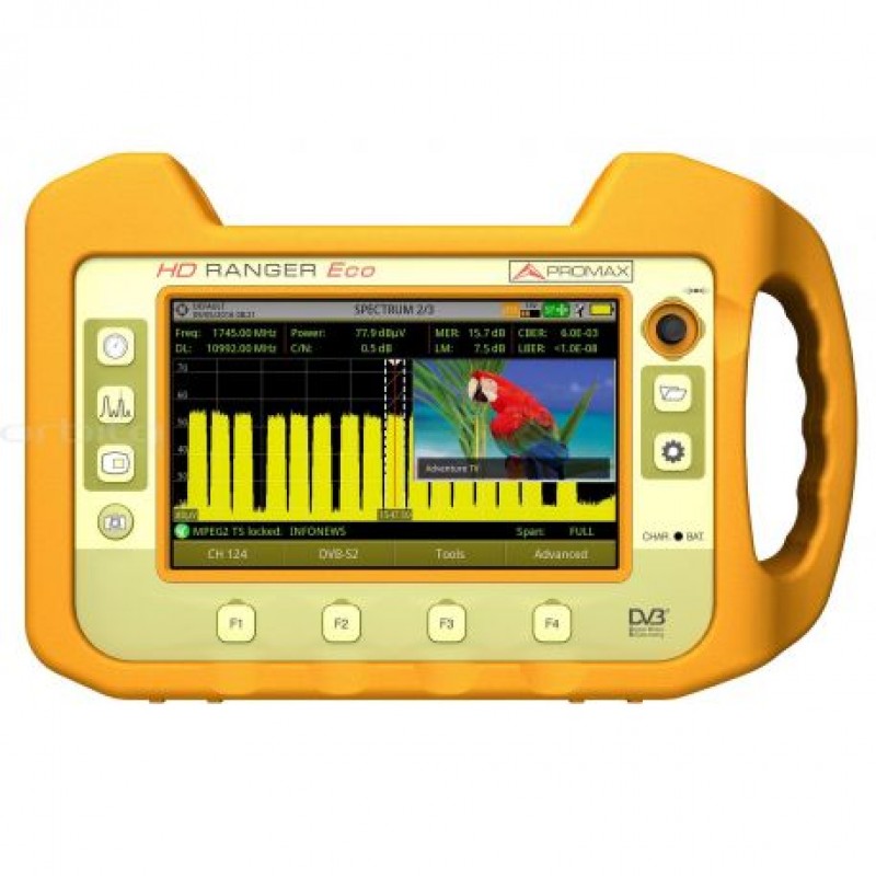 Το RANGER Eco της Promax είναι ένας Universal μετρητής εντάσεως πεδίου που καλύπτει μια ολοκληρωμένη δέσμη προτύπων εκπομπής σε όλο τον κόσμο. Οι τελευταίες εξελίξεις στην τεχνολογία μετάδοσης, όπως το DVB-T2/C2/S2 (επίσης περιλαμβάνονται DVB-T/C/S) με MPEG-2 καθώς και MPEG-4 Video, διαχειρίζονται εύκολα μέσα στο προϊόν.