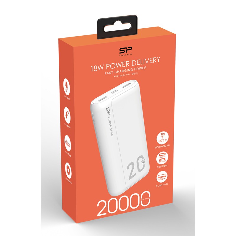 Με το power bank QS15 της Silicon Power το άγχος της εξαντλημένης μπαταρίας θα είναι παρελθόν. Η μπαταρία μεγάλης χωρητικότητας 20.000mAh, είναι σε θέση να φορτίσει το smartphone σας ή όποια άλλη συμβατή συσκευή, 4-6 φορές με μια μόνο φόρτιση. Διαθέτει 2 θύρες εξόδου USB και 1 θύρα εξόδου/εισόδου USB Type-C (PD) με συνολική απόδοση έως 18W. Επιπλέον, εξοπλίζεται με 4 LEDS indicators για την ένδειξη της μπαταρίας και φορτίζει μέσω θύρας USB Type-C ή Micro USB.