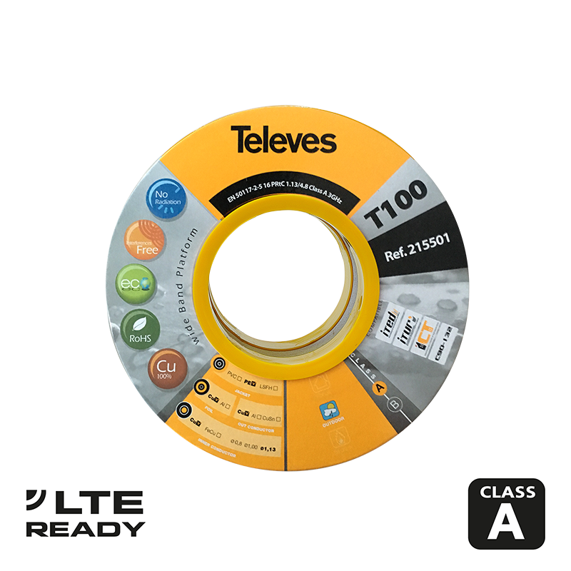 To Televes 215501 ΚΑΛΩΔΙΟ Coaxial T100plus Cu/Cu Fca PE Black , σε στροφίο 100 μέτρων, είναι 100% Χαλκός στον αγωγό (διαμέτρου 1,13 χιλ.) και στο μπλεντάζ, με προδιαγραφές ΕΞΩΤΕΡΙΚΟΥ ΧΩΡΟΥ, προσφέροντας εξαιρετική αγωγιμότητα και χαμηλή εξασθένιση στο σήμα, σε όλο το φάσμα των συχνοτήτων. Συμβατό με ψηφιακά σήματα, μπορεί να χρησιμοποιηθεί σε κάθε εγκατάσταση δορυφορικού και επίγειου τηλεοπτικού σήματος, καθώς και σε εγκαταστάσεις CCTV, προσφέροντας εξαιρετική μεταφορά σήματος με χαμηλές απώλειες και σταθερό, αξιόπιστο αποτέλεσμα ακόμα και με την πάροδο του χρόνου. Διαθέτει κάλυμα απο ΡΕ για ανθεκτικότητα στο νερό και στα καιρικά φαινόμενα, καθιστώντας το πιστοποιημένο για εγκατάσταση σε εξωτερικές οδεύσεις αλλά και όπου απαιτείται ομοαξονικό καλώδιο RG6 κορυφαίων προδιαγραφών.