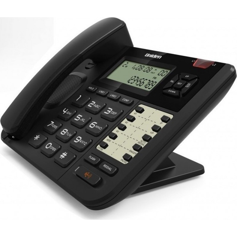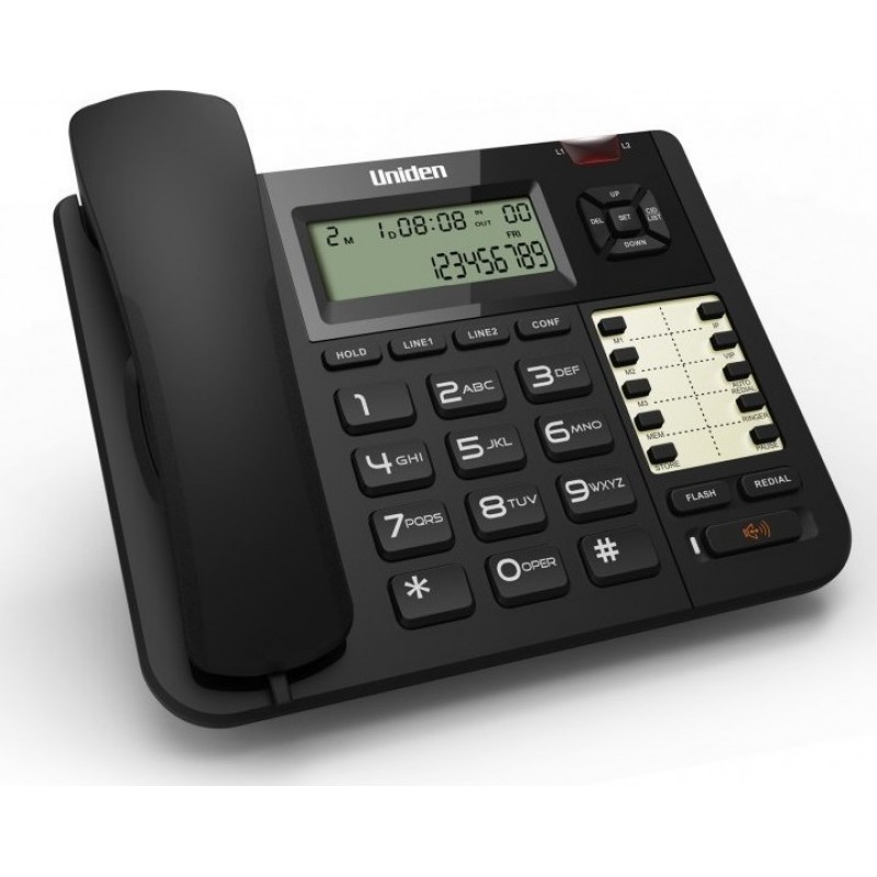 Δίγραμμο τηλέφωνο ποιότητας της ιαπωνικής Uniden με φωτιζόμενη οθόνη, αναγνώριση κλήσης και δυνατότητα conference, ανοικτή συνομιλία με μνήμη εισερχόμενων και εξερχόμενων κλήσεων, 3 άμεσες μνήμες, μαζί με ακουστικο, Συνδιάσκεψη 3 ατόμων, αυτόματη επανακλήση, με νέο δεικτη κλήσεων, δυνατότητα επιτοίχιας τοποθέτησης, 20 εισερχόμενες γραμμες CID και 5 εξερχόμενες γραμμες CID, μουσική κατά την αναμονή, Λειτουργία ανοιχτής ακρόασης, Ρυθμιζόμενη ένταση κουδουνίσματος, Λειτουργία Flash με χρονική ρύθμιση 100/300/600/1000ms, Ψηφιακή οθόνη LCD δύο γραμμών, Αναγνώριση κλήσεων DTMF/FSK